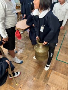 学習会では、ネパールで使われている水瓶を実際に運んでみたり、ユニセフが支援グッズとして使っている蚊帳に入ってみるなどの体験も行いました。